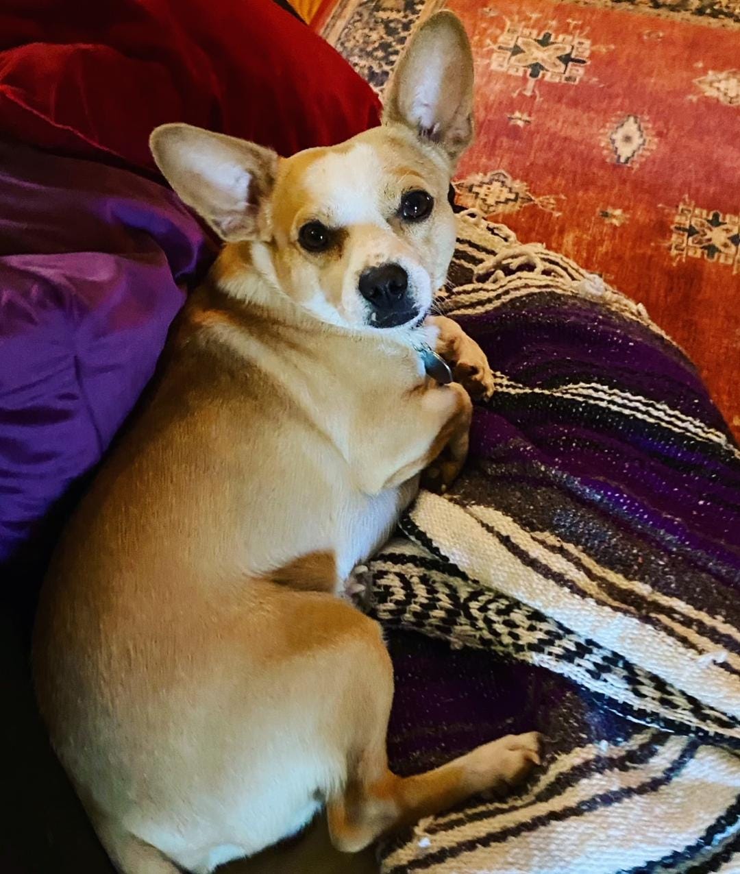 In the homestretch of our walk today, Spud— our 17-pound Chihuahua-Corgi mix— was suddenly face-to-face with a giant Boxer who came charging out from behind a storage shed. No collar, no attached person, nothing— just naked, enormous, 100+ pounds of dog we’ve never met. As much as we were startled, I noticed this big fella wasn’t barking. Instead, his little stubby tail was ticking rapidly back and forth like a metronome. He and Spud were sniffing nose-to-nose— taking in one another’s scent and busily forging a bond. Within 2 minutes, this massive animal was leaning in and giving me kisses... So much for being a threat! Spud, in the excitment of meeting someone new, quickly slipped out of his harness and was jumping up and down wearing only his collar— but, thanksfully, not trying to make a getaway. I was able to get the harness back on and reclip his leash, all with his new friend trying to help. Am relaying this little story because my initial reaction to a huge dog suddenly appearing before us was, understandably, a fear response. Upon recognizing the perceived threat as none other than an imposing marshmallow, fear melted into fun and we happily played with our new Boxer pal until he was ready to go back home. We faced the fear, whatever we thought it might bring, and found that the dragon just wanted to play.